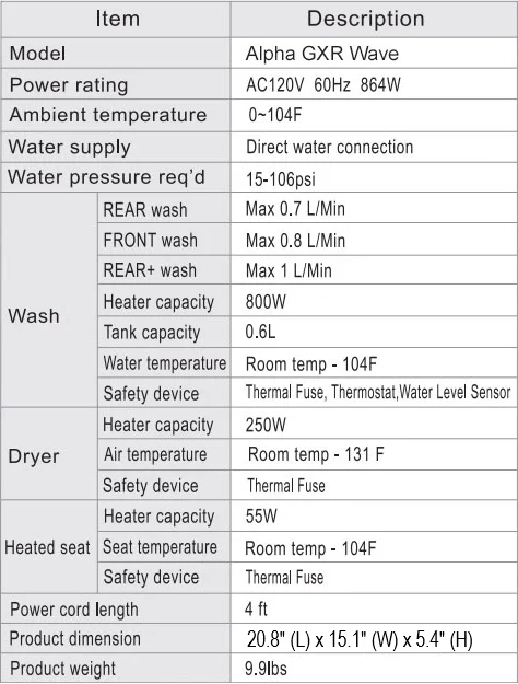 Hybrid Heating System – The Alpha GXR Wave features hybrid heating technology that produces instant warm water, while also continuing to heat the water through the wash cycle. Warm water lasts about 1 minute in Rear wash mode, and about 40 seconds in Rear+ mode. The water temperature will slowly decrease over time, but it never turns completely cold either.
