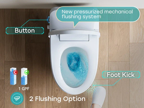 Choose between two convenient flushing options: a quick foot-kick flush for hands-free ease or a side botton flush for a more traditional, manual experience.
